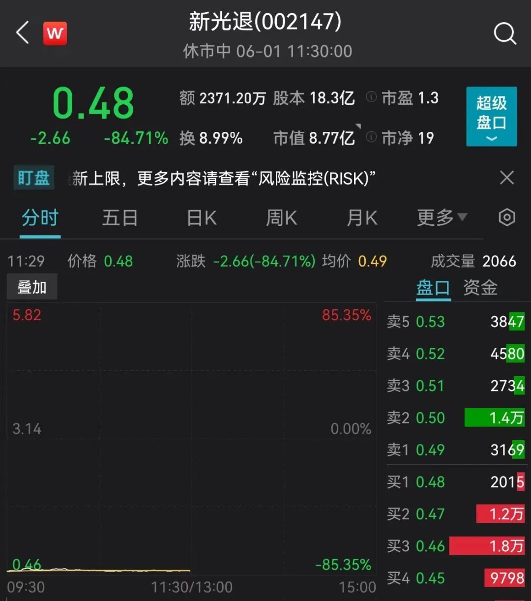 6月1日,又有两家上市公司进入退市整理期。截止发稿,新光退暴跌84.71%,科迪退暴跌68.78%。
