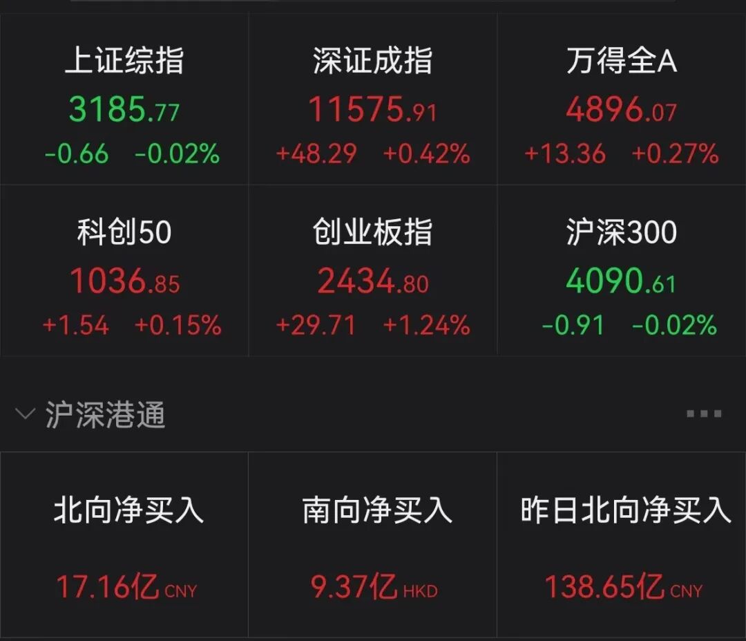 截至午间收盘,两市超2900只个股上涨。沪深两市半日成交额达5436亿,较上个交易日上午缩量71亿。沪指跌0.02%,深成指涨0.42%,创业板指涨1.24%。北向资金方面,沪股通早盘净流入3.59亿,深股通早盘净流入15.03亿。