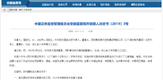 除了债务问题外,新光圆成内部问题层出不穷,还涉及多项违法违规行为。2019年12月,新光圆成及相关人员收到中国证券监督管理委员会安徽监管局下发《行政处罚决定书》。其中显示,周晓光、虞云新作为新光圆成董事、实际控制人,其指使、安排新光集团非经营性占用上市公司资金的关联交易事项、上市公司违规担保事项、共同借款事项,不履行信息披露义务,情节严重。