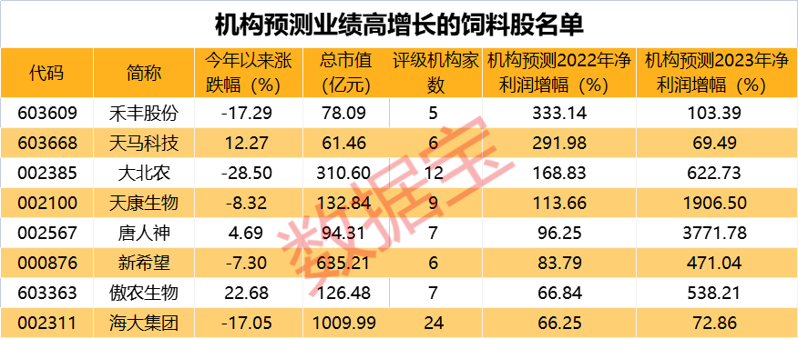 综合市面机构的研判观点来看,年初以来,随着豆粕等饲料原料成本压力剧增,没有规模优势和配方研发储备优势的中小企业加速退出,市场份额进一步向头部集中,头部公司的竞争环境进一步优化,一季度或为全年业绩低点,后续有望呈现逐季改善的趋势。从今年、明年的业绩预期来看,至少5家机构一致认为禾丰股份、天马科技、唐人神、海大集团等8股今明两年业绩有望持续高增长。