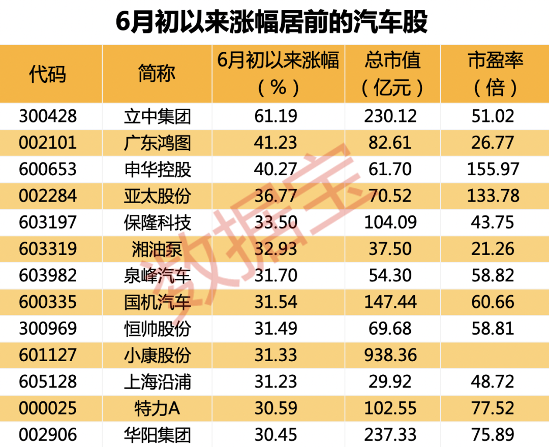 证券时报·数据宝统计,月初以来已有13只汽车股累计涨幅超过30%,立中集团涨幅最高,为61.19%,其他还有广东鸿图、申华控股涨40%以上。