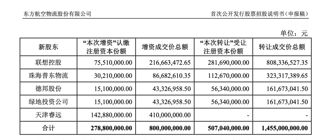 根据东航物流招股书,上述两家公司与东航物流结缘始于2017年。这一年6月19日,东航物流有限、东航产投、联想控股、珠海普东物流、天津睿远、德邦股份及绿地投资共同签订《增资协议》,约定东航物流新增注册资本2.79亿元,其中联想控股、珠海普东物流、德邦股份、绿地投资作为投资方以货币方式出资3.9亿元,其中1.36亿元计入实收资本,2.54亿元计入资本公积。同时,东航产投向联想控股、珠海普东物流、德邦股份及绿地投资转让其持有的东航物流有限原注册资本中5.07亿元出资额的对应股权,转让的实际成交总价为14.55亿元。