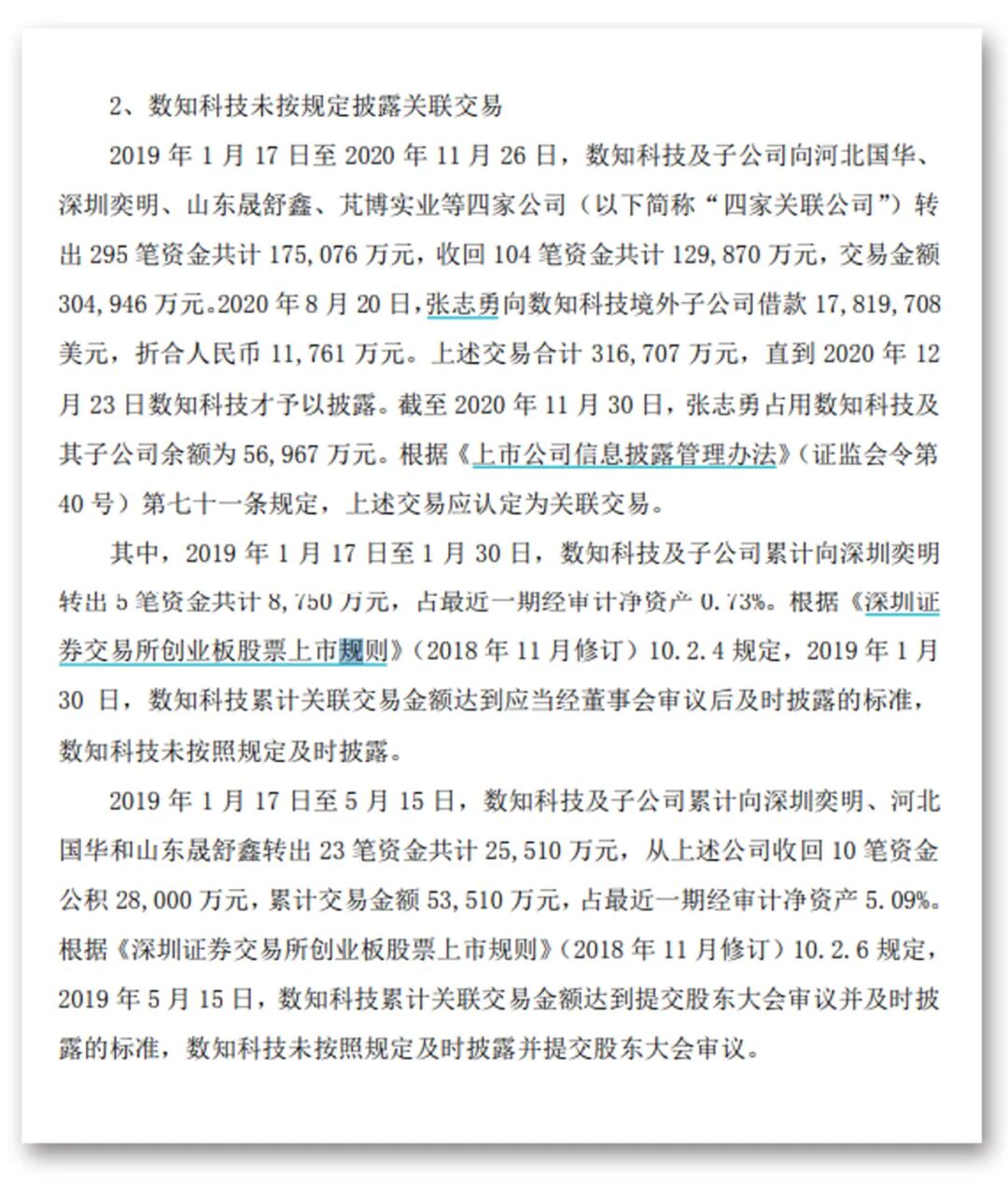 2019年1月17日至2020年11月26日,数知退及子公司向河北国华、深圳奕明、山东晟舒鑫、芃博实业等四家公司转出295笔资金共计17.51亿元,收回104笔资金共计12.99亿元。2020年8月20日,张志勇向数知退境外子公司借款1.18亿元。上述关联交易合计达31.67亿元,直到2020年12月23日数知退才予以披露。
