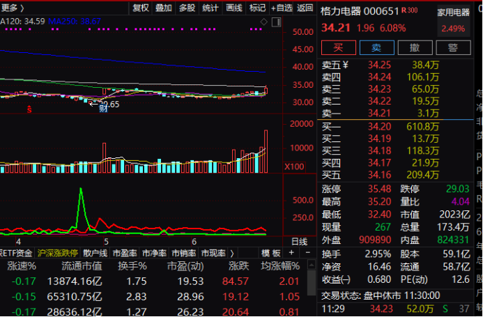 除了市场指数有重大突破外,板块方面也呈现轮动之势,轮替较好,今天上午家电板块大涨,其中近年总体低迷的家电龙头格力电器爆发,盘中一度大涨超过9%。