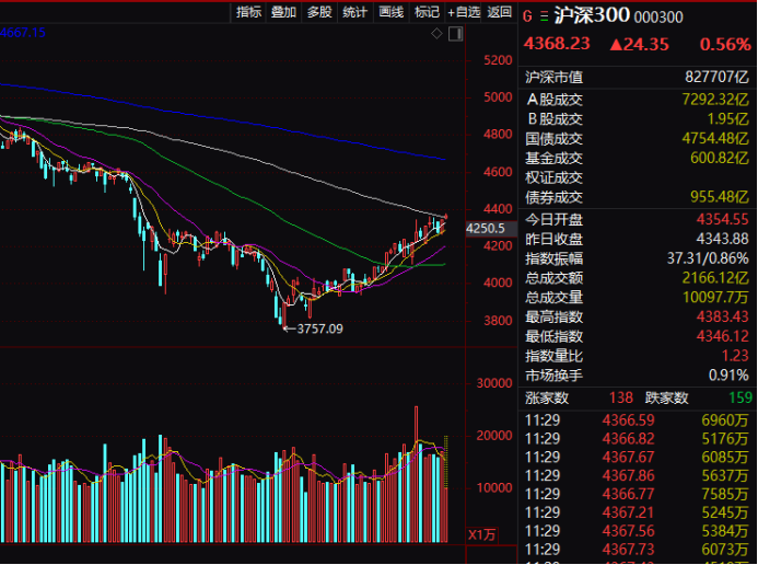 深证成指的“闯关”不是特例。同样在今天上午,A股市场另一大重要指数——沪深300指数也成功“闯关”,不断向4400点逼近,也突破了半年线的压制。