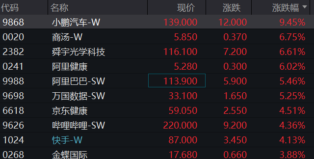 恒生科技指数成份股中,造车新势力依旧领涨。小鹏汽车-W盘中大涨超过10%。商汤-W、舜宇光学科技、阿里健康等涨幅居前。