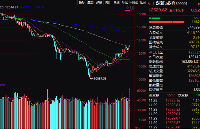 行情数据显示,A股市场今天继续“闯关”,深证成指上午盘中一度达到12680.59点,这一点位已超过半年线数值,意味着深证成指最近5个月来首度突破半年线。