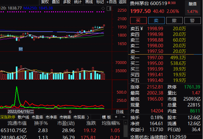 两市最“贵“的股票——贵州茅台股价也有重大突破,盘中股价重新回到2000元之上,创近5个月新高。