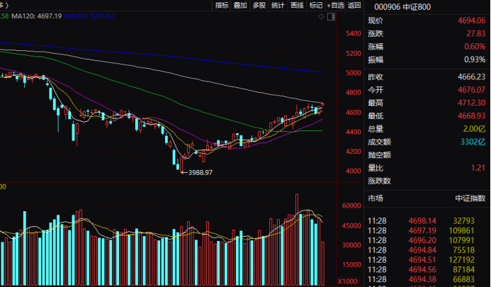 中证800指数于今天上午实现突破,盘中也站上半年线。