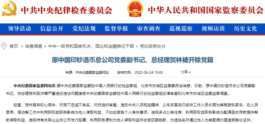 据中央纪委国家监委驻中国人民银行纪检监察组、北京市东城区监察委员会消息:日前,原中国印钞造币总公司党委副书记、总经理贺林因涉嫌严重违纪违法问题接受中央纪委国家监委驻中国人民银行纪检监察组纪律审查和北京市东城区监委监察调查。