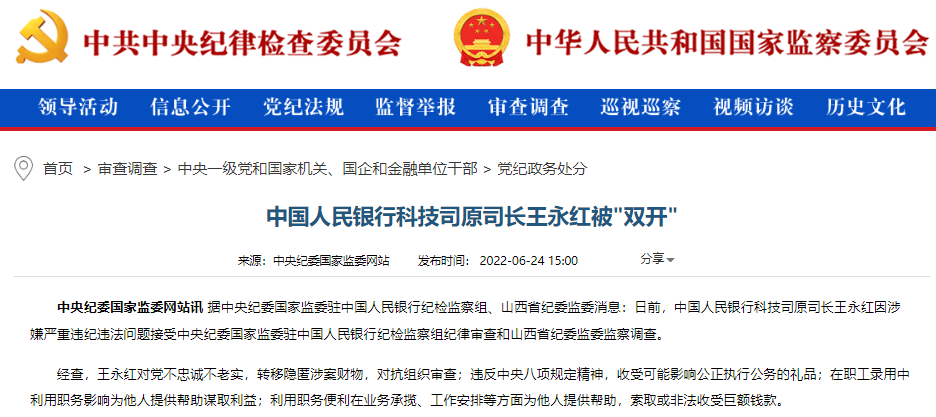 6月24日,据中央纪委国家监委网站显示,中国人民银行科技司原司长王永红、原中国印钞造币总公司党委副书记、总经理贺林因严重违纪违法被严肃处理。