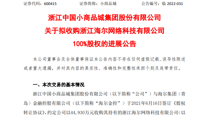 6月24日晚间,小商品城发布了一则《关于拟收购浙江海尔网络科技有限公司100%股权的进展》,公告指出,监管部门已经同意了快捷通关于变更实际控制人的批复,批复同意快捷通现有实际控制人海尔金控将所持海尔网络100%股权转让给公司。变更后,公司通过海尔网络间接持有快捷通100%股份,成为快捷通实际控制人。