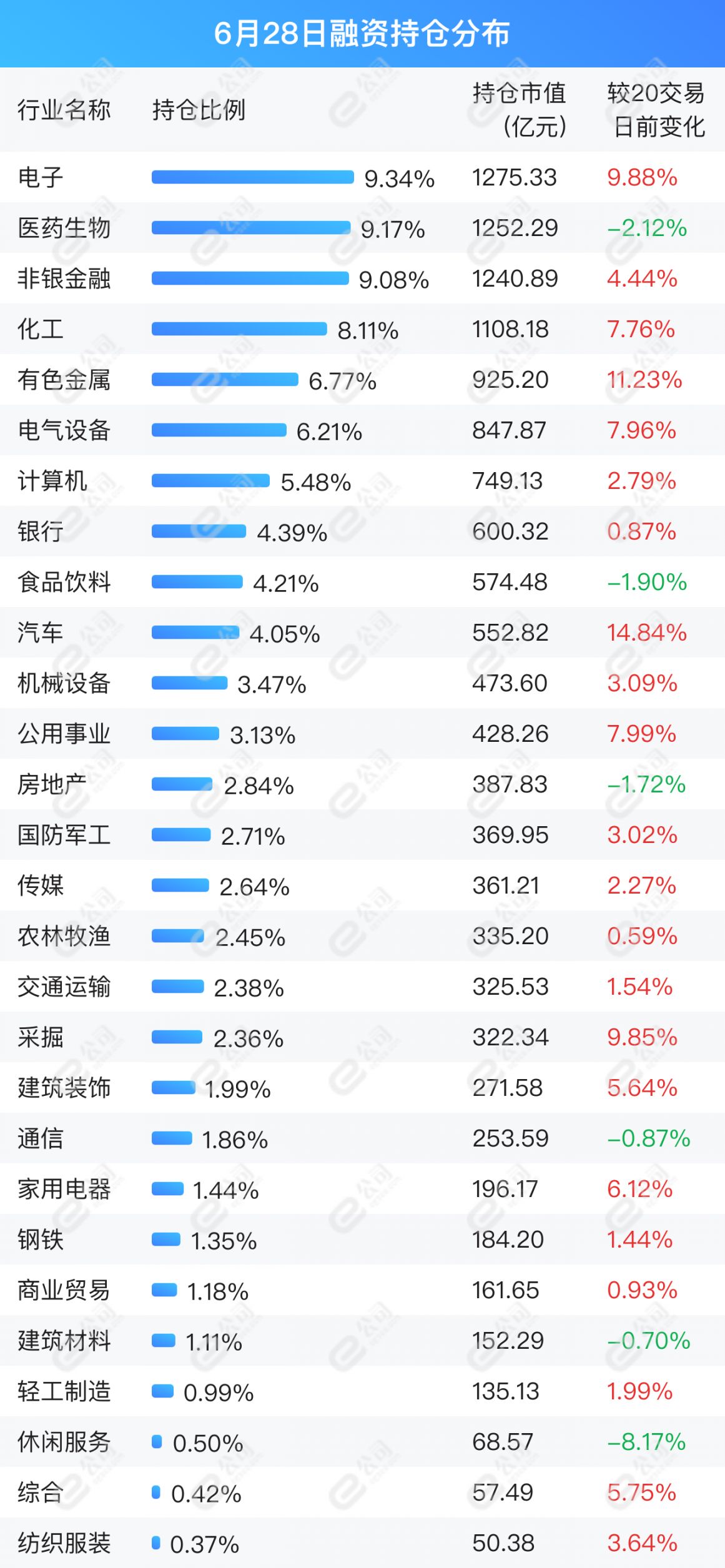 e公司数据统计显示,截至6月28日,融资持仓市值前五行业为电子、医药生物、非银金融、化工、有色金属,占持仓总市值42.47%。