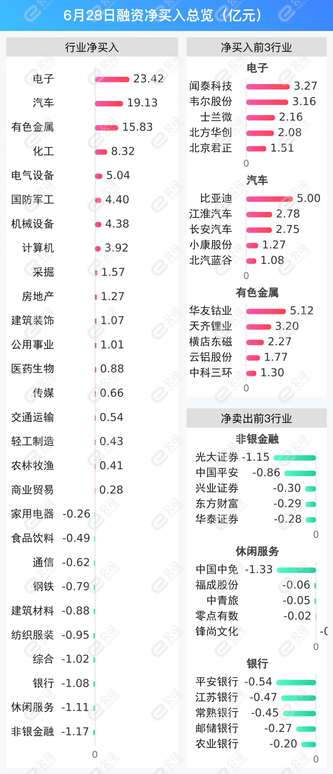电子、汽车、有色金属获融资净买入金额居前,分别为23.42亿元、19.13亿元、15.83亿元。