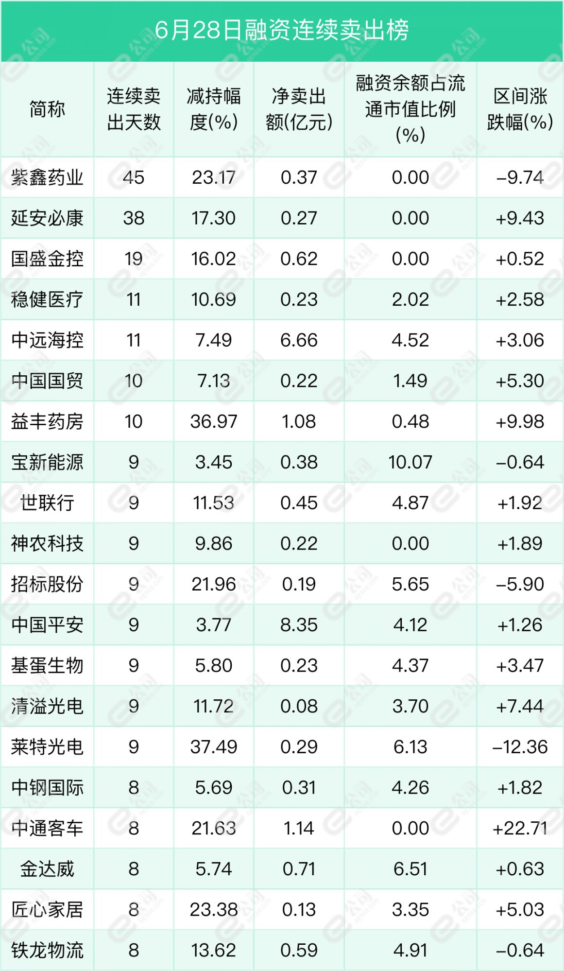 紫鑫药业、延安必康、国盛金控遭融资连续净卖出天数居前,分别为45天、38天、19天,期间净卖出额分别为0.37亿元、0.27亿元、0.62亿元,期间减持幅度分别为23.17%、17.3%、16.02%。