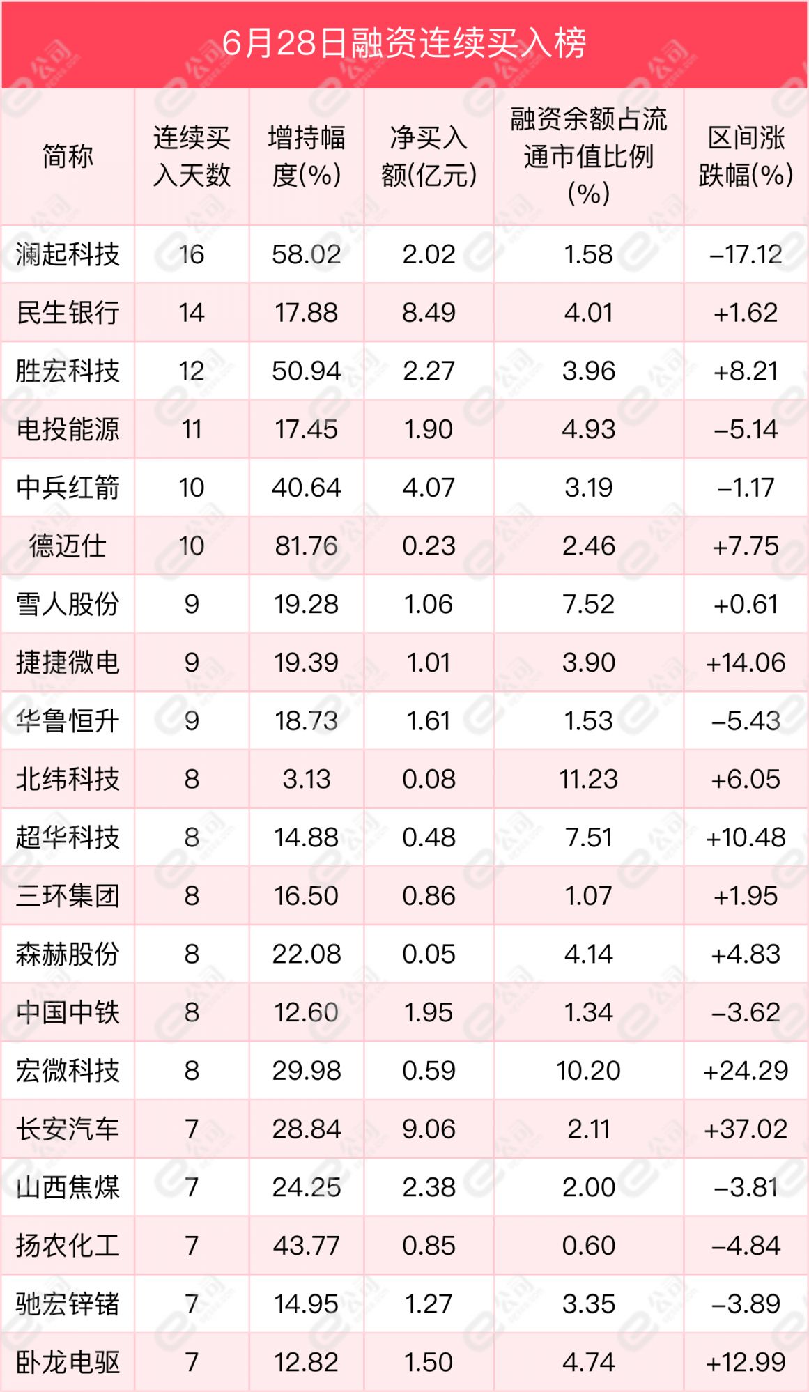 从连续买卖来看,澜起科技、民生银行、胜宏科技获融资连续净买入天数居前,分别为16天、14天、12天,期间净买入额分别为2.02亿元、8.49亿元、2.27亿元,期间增持幅度分别为58.02%、17.88%、50.94%。