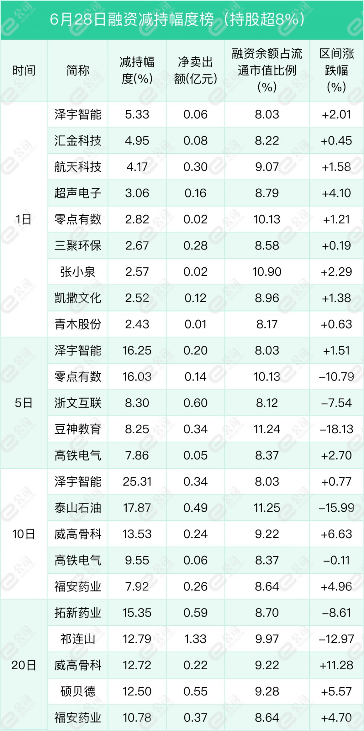 泽宇智能、汇金科技、航天科技遭融资减持幅度居前,分别为5.33%、4.95%、4.17%。