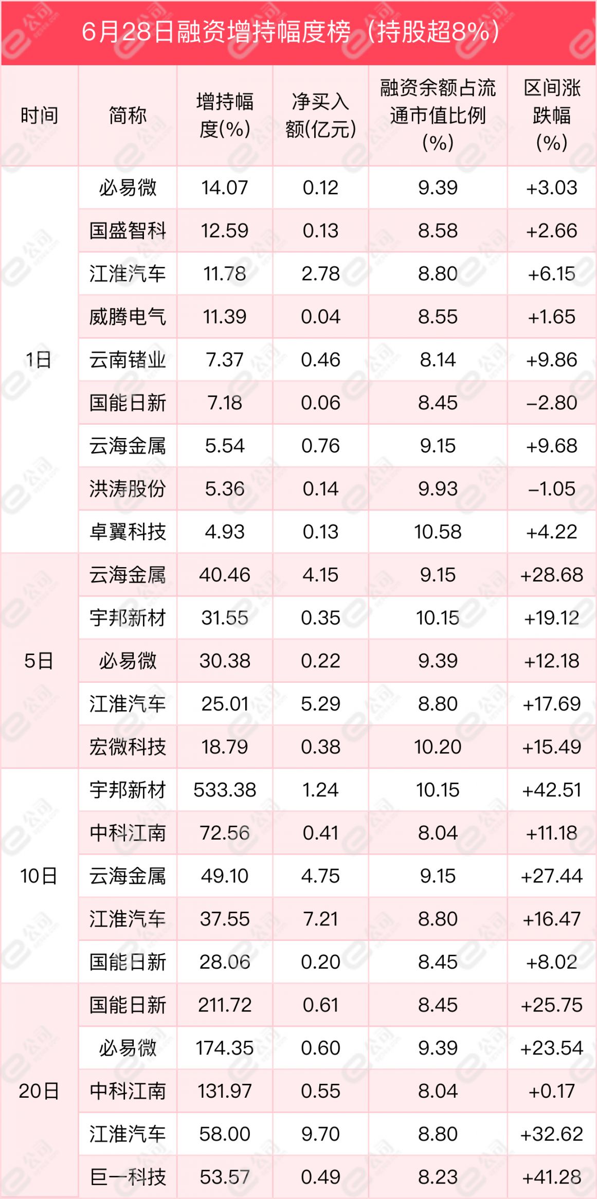 从增减持幅度来看,融资余额占流通股比例超8%的个股中,必易微、国盛智科、江淮汽车获融资增持幅度居前,分别为14.07%、12.59%、11.78%。