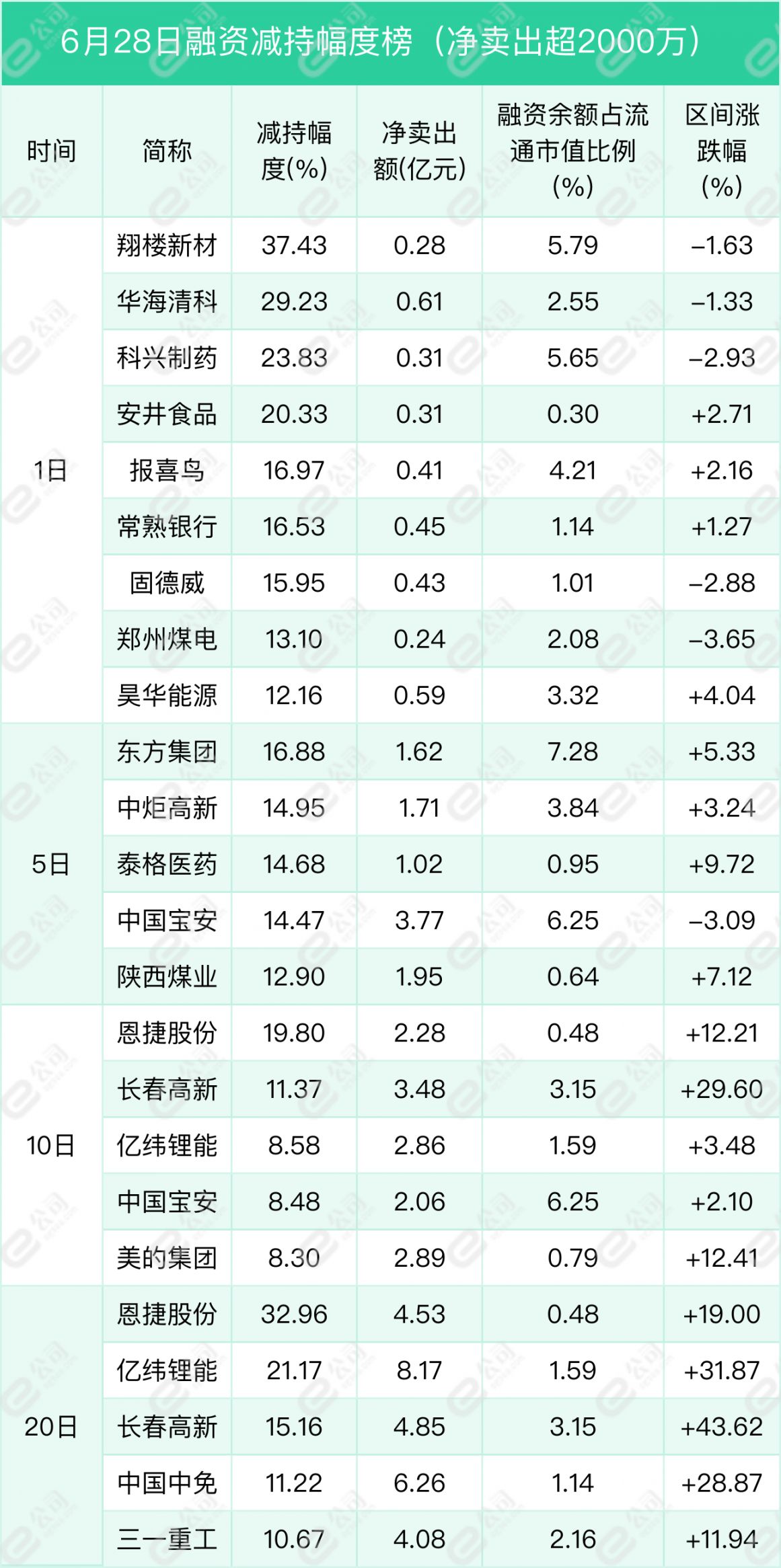 翔楼新材、华海清科、科兴制药遭融资减持幅度居前,分别为37.43%、29.23%、23.83%。