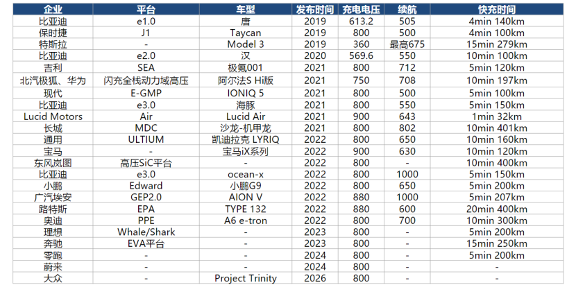 高电压是实现快充的重要路径,2022-2023年车企纷纷推进高压快充新平台研发设计,并加速布局高功率充电桩。