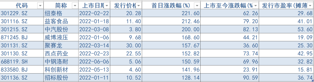 从涨幅观察,上半年上市首日涨幅最高新股是纽泰格。2月22日纽泰格在创业板上市,发行价为20.28元,盘中最高股价达到80元,触发二次临停。截至收盘大涨221.6%。按照盘中最高价计算,中一签大赚29860元。