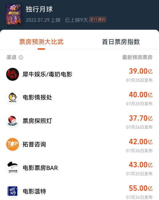 在上映前几天,行业媒体对该片的预测票房最低为37.7亿元,最高则达到55亿元。即便取中间值,该片也有望拿下今年票房冠军。
