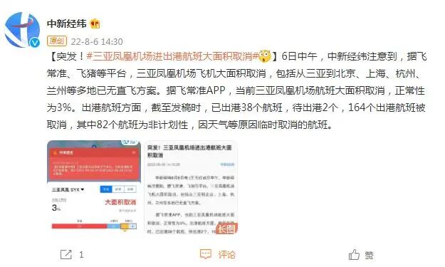 6日中午,中新经纬注意到,据飞常准、飞猪等平台,三亚凤凰机场飞机大面积取消,包括从三亚到北京、上海、杭州、兰州等多地已无直飞方案。