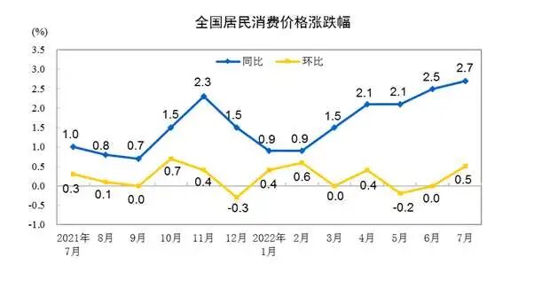 8月10日,国家统计局发布2022年7月份全国CPI和PPI(工业生产者出厂价格指数)数据。CPI同比上涨2.7%,涨幅比上月扩大0.2个百分点,环比由上月持平转为上涨0.5%。PPI同比上涨4.2%,涨幅比上月回落1.9个百分点,环比由上月持平转为下降1.3%。