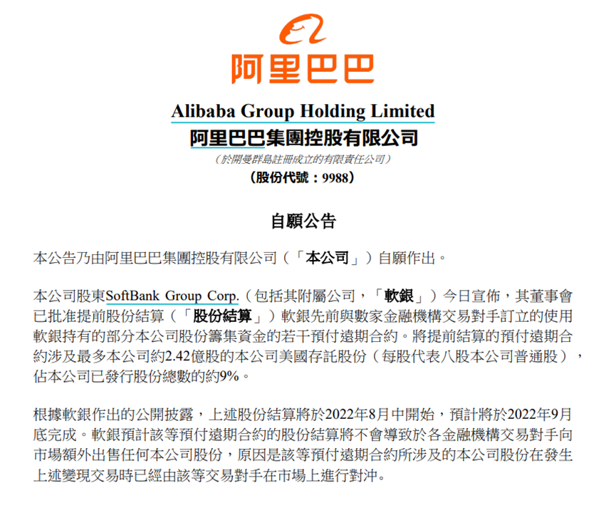 今日,阿里巴巴港股也发布自愿公告,公司股东SoftBank Group Corp.(包括其附属公司,“软银”)今日宣布,其董事会已批准提前股份结算软银先前与数家金融机构交易对手订立的使用软银持有的部分公司股份筹集资金的若干预付远期合约。将提前结算的预付远期合 约涉及最多约2.42亿股的阿里巴巴美国存托股份,占阿里巴巴已发行股份总数的约9%。