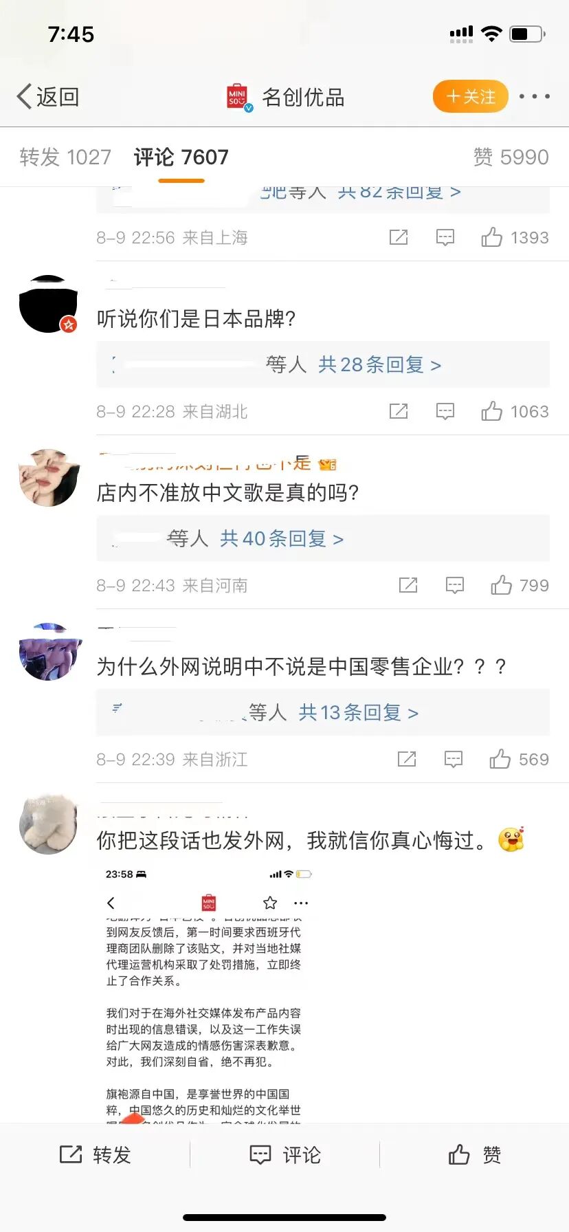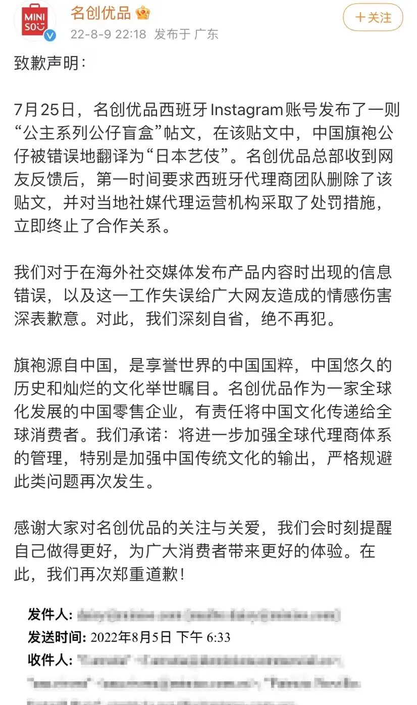 8月9日晚间,名创优品回应分不清旗袍和艺伎服饰致歉称,7月25日,名创优品西班牙Instagram账号发布了一则“公主系列公仔盲盒”帖文,在该帖文中,中国旗袍公仔被错误地翻译为“日本艺伎”。名创优品总部收到网友反馈后,第一时间要求西班牙代理商团队删除了该帖文,并对当地社媒代理运营机构采取了处罚措施,立即终止了合作关系。