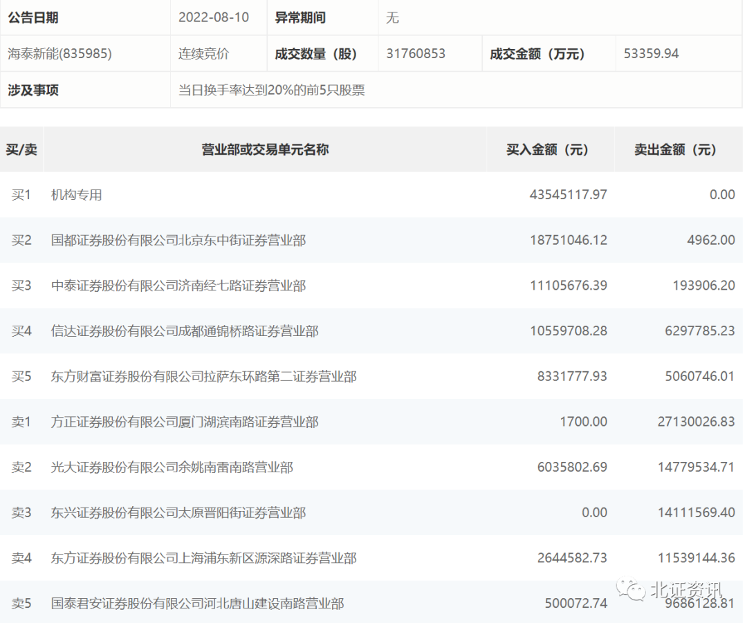 值得一提的是,海泰新能今天遭到机构疯狂扫货。北交所盘后公开信息显示,海泰新能有买一为机构专用席位,共净买入4354.51万元,创下机构单日扫货北交所股票的纪录!此外,还有三家营业部的买入额也超过1000万元,包括国都证券股份有限公司北京东中街证券营业部买入1875.1万元,中泰证券股份有限公司济南经七路证券营业部、信达证券股份有限公司成都通锦桥路证券营业部分别吸纳了1110.57万元、1055.97万元。卖出方面,卖一为方正证券股份有限公司厦门湖滨南路证券营业部,卖出2713万元;卖二为光大证券股份有限公司余姚南雷南路营业部,卖出1477.95万元。