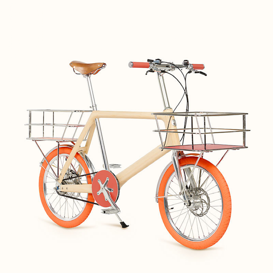 这款机械单车,采用白蜡木、铝和Spad皮革打造,把手及坐垫支架处配有车灯,前侧饰有系列标识上釉徽章,坐垫处饰有“Hermes Paris”烫印字样,单车前后装配有车篮子,支持4档速度调节。产品细节介绍称,该车座位可调节高度以适应不同身高的使用者。设计灵感源自日式便携单车,该车为法国制造。标注售价为16.5万元。