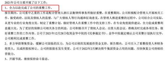 在2021年年报中,ST众泰称,2021年是公司发生重大转折的一年,公司投入了更多的精力和努力配合管理人开展重整工作,尽最大努力最大限度地保护好相关各方的利益,全力以赴完成了重整工作。