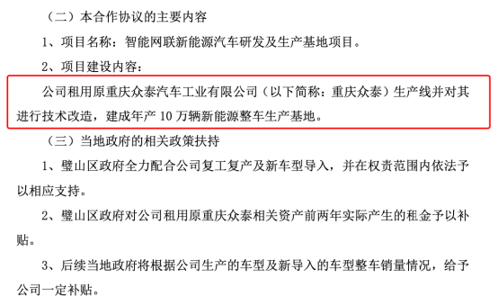 在该项目中,璧山区政府全力配合ST众泰复工复产及新车型导入,并在权责范围内依法予以相应支持。同时对公司租用原重庆众泰相关资产前两年实际产生的租金予以补贴。