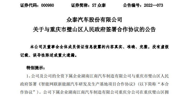 公告显示,ST众泰及其全资下属企业湖南江南汽车制造有限公司(以下简称“江南汽车”)璧山区政府于8月19日签署了《智能网联新能源汽车研发及生产基地项目合作协议》 。