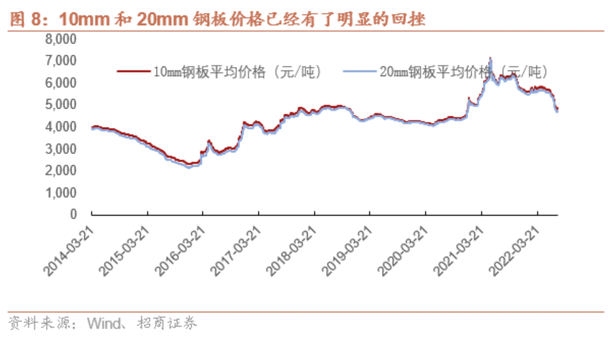 短期视角下,集装箱运价下调、干散货船运价高位震荡、油船运价上行,表明下游航运企业景气度可能依船型有所分化。集运运价下调影响了集装箱船的短期租金,影响新签订单,干散货和油船运价对新船订单影响并不直接。另一方面,今年以来船用钢板价格持续下滑,人民币兑美元汇率相比去年有明显走低,船舶企业短期的利润拐点将有所显现。