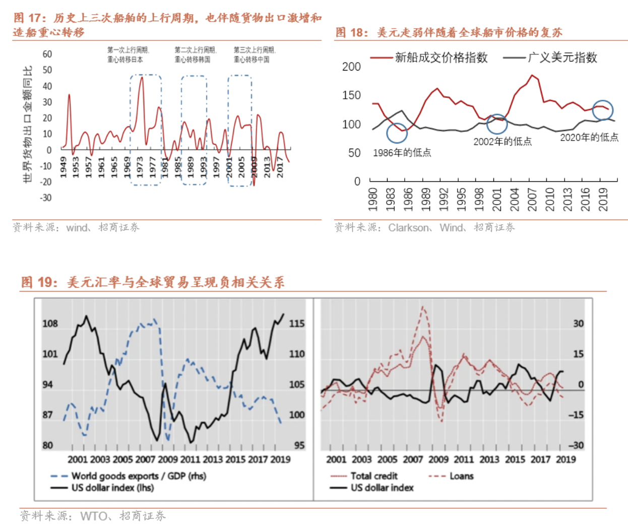 在最新2020年的广义美元指数的低点,新船价格指数也迎来上涨的机遇,全球贸易出口增速也得到提高。尽管近来人民币贬值且美联储加息影响了广义美元指数的走势,但长期来看,美元继续走弱仍是大势所趋。因此,在全球贸易出口这个视角,船舶行业已经处于上行大周期的起点位置。