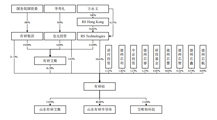 2017年11月,有研集团与RS科技、仓元投资三方共同出资设立有研艾斯。其中,有研集团以有研半导体100%股权认缴注册资本6791.54万美元,占股49%。RS科技、仓元投资分别以货币出资6237.13万美元、831.62万美元,占股45%、6%。仓元投资由方永义的太太持有,和RS科技为一致行动人,二者合计持股51%。