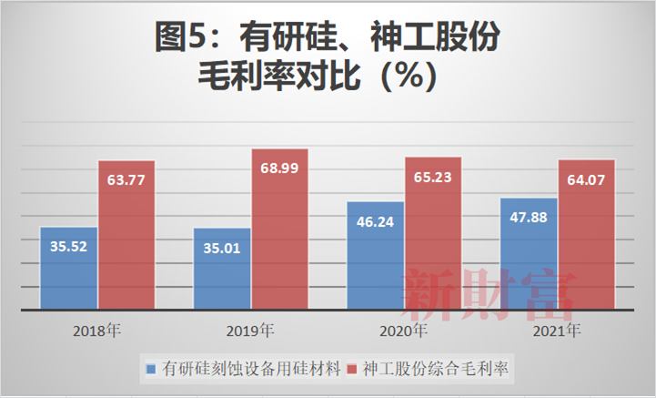 但和同行相比,则其盈利水准仍显不足。神工股份与有研硅的刻蚀设备用硅板块营收相当,但其综合毛利率近3年始终在60%以上,比有研硅可比业务要高出24个百分点(图5)。2021年,神工股份三大主打产品15寸以下、15-16寸、16寸以上硅片,毛利率依次为60%、63%、76%,综合毛利率64%,比有研硅整体高出近36个百分点。