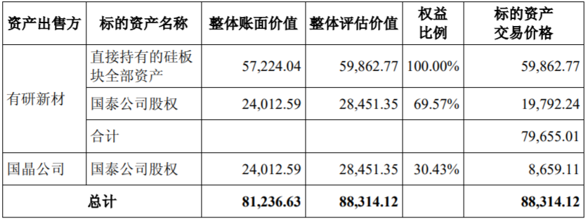 2014年12月,有研新材和国晶公司将硅板块资产以及国泰半导体股权全部转让给有研总院(即有研集团)。其中,国泰半导体价值大约2.845亿元,硅板块资产价值大约6亿元,两块资产总计作价8.83亿元(表1)。