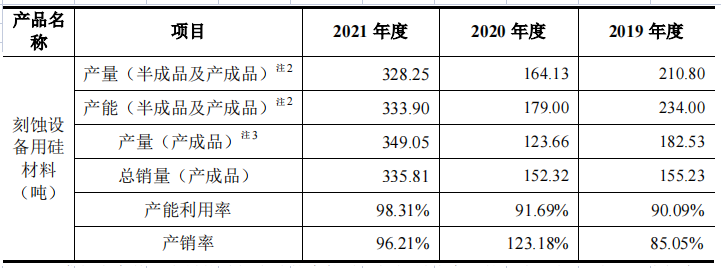 表4:刻蚀设备用硅材料产量、销量、产销率等变化
