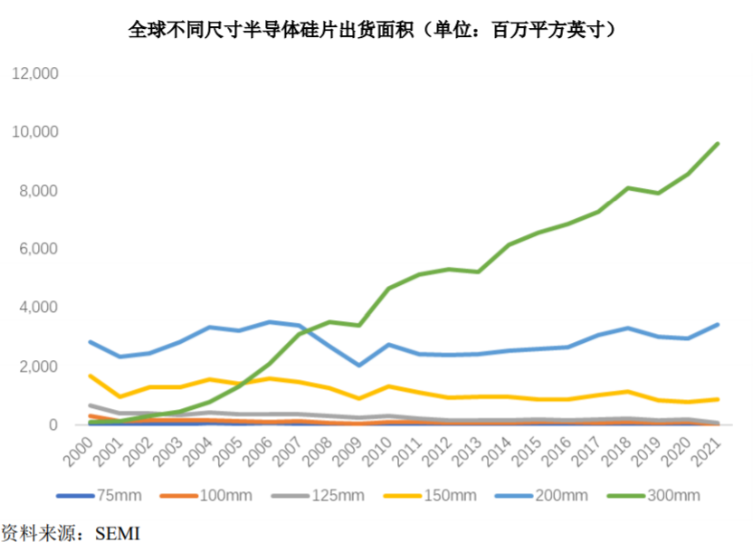 图6:全球不同尺寸硅片出货面积(单位:百万平方英寸)