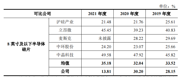 与可比公司相比,2021年,有研硅8英寸及以下产品的毛利率为13.81%,比行业均值少20多个百分点,2019年也少5个百分点(表6)。