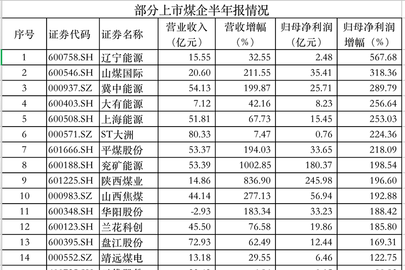 从已披露半年报的36家上市煤企看,仅云煤能源、安源煤业两家出现亏损,其他均实现盈利,这其中有14家净利增幅超过100%。