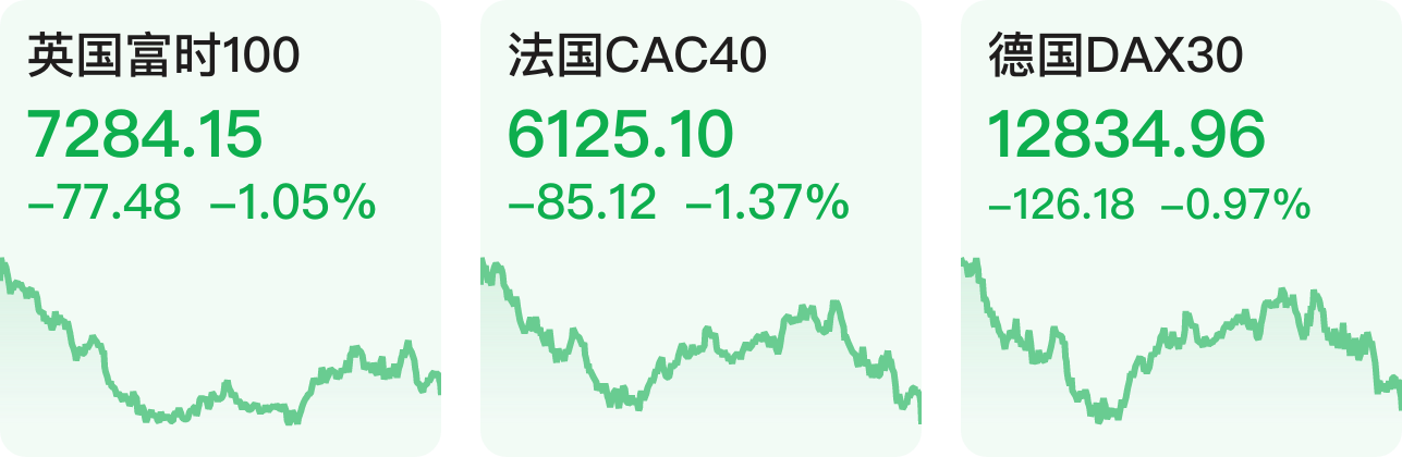 欧洲三大指数全部下跌。截至收盘,英国富时100指数跌1.05%,法国CAC40指数跌1.37%,德国DAX30指数跌0.97%。