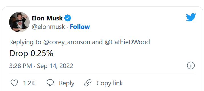当地时间周三,全球首富马斯克直接点赞伍德的观点,马斯克在推特表示,美联储应该“降息0.25%”,美联储激进加息将导致美国经济陷入通缩。