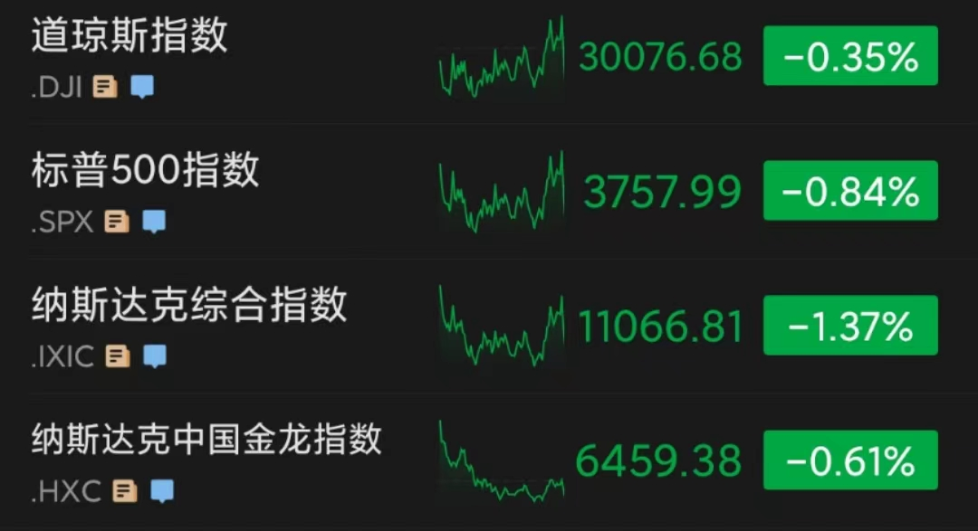 当地时间周四,美股三大指数集体下挫。道指跌0.35%,标普500指数跌0.84%,纳指跌1.37%,均录得“三连跌”。