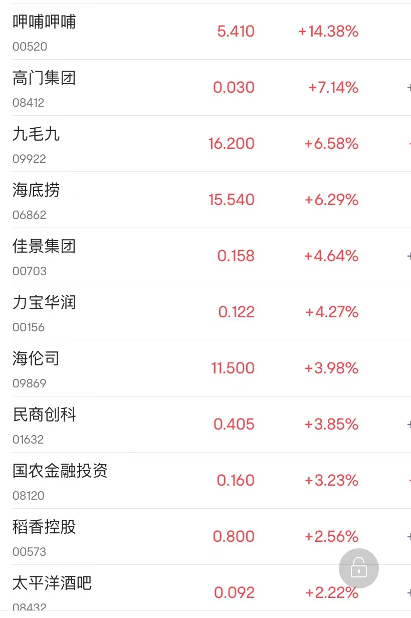 呷哺呷哺涨超14%,高门集团涨超7%,九毛九涨超6.5%,海底捞涨超6%,佳景集团、力宝华润涨超4%,海伦斯涨近4%。