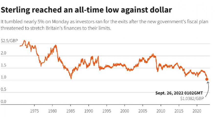 消息面上,根据新华社此前报道,英国政府23日宣布一系列措施以期提振经济,包括大规模减税、取消银行业奖金上限等,为英国50年来最激进减税计划。同日,英国股市下挫,英镑对美元汇率跌至37年来新低。今日,英镑盘中再度重挫,一度下跌4.9%,至1.0327美元的历史最低点。