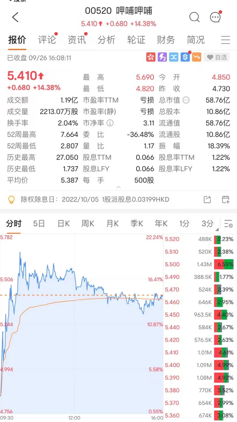 港股“连锁餐饮第一股”呷哺呷哺盘中一度涨超20%,创5个月新高,收盘涨超14%,报5.4港元/股,最新总市值58.76亿港元,本月已累计涨超50%。